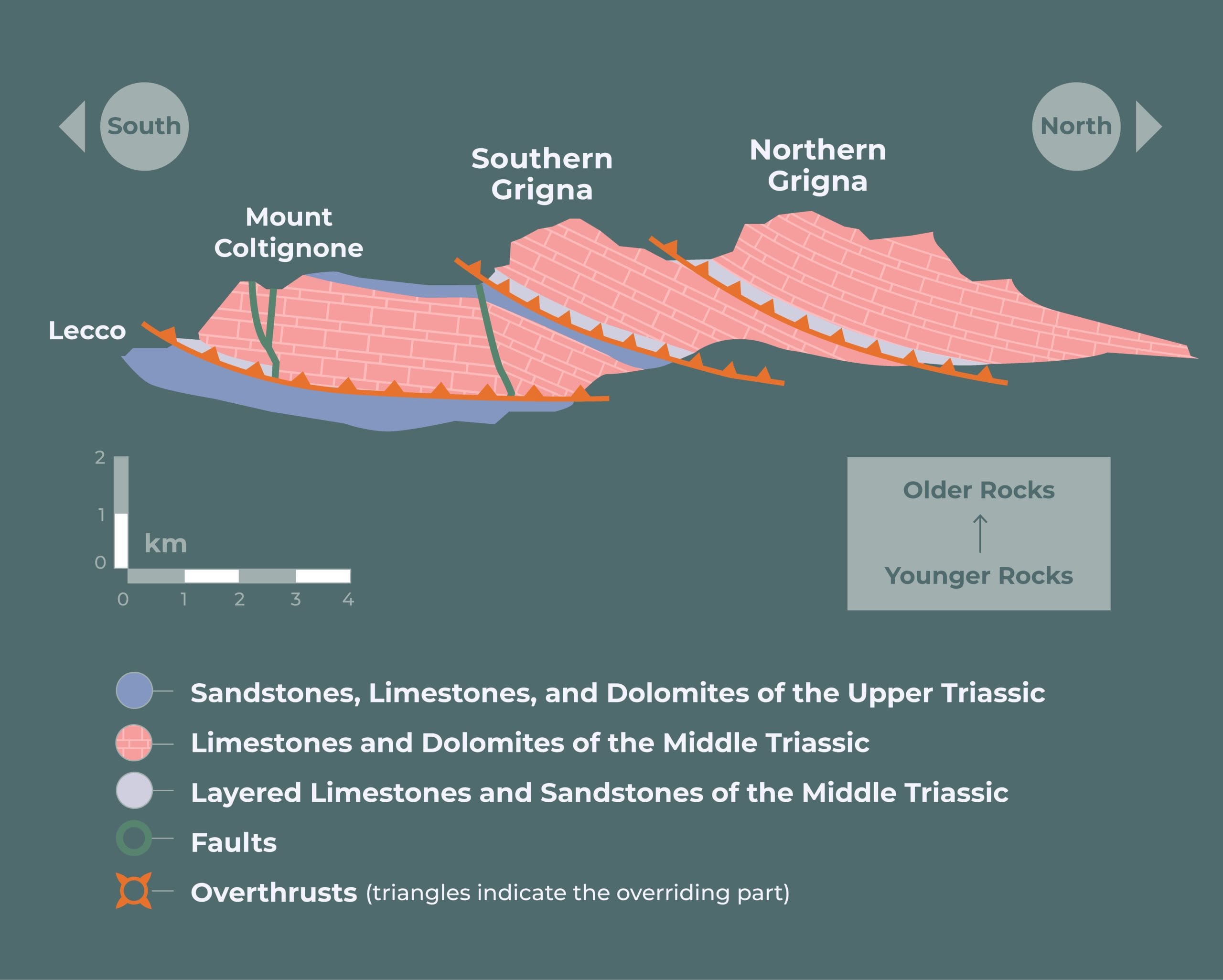 Geology – The development of the landforms is controlled by geological factors and is much less random than one might think. Piani d’Erna constitutes a natural environment that develops at an average altitude of around 1,200-1,350 metres between two steep walls: the western slope of Pizzo d’Erna downstream and the slopes of Resegone upstream. Between these two rocky walls is a much softer type of rock, eroded over time by atmospheric agents (a situation clearly visible in the geological profile on the lower left). The development of the natural terrace was also favoured by the presence of important faults that caused the fracturing of the argillites, making these rocks even more easily eroded