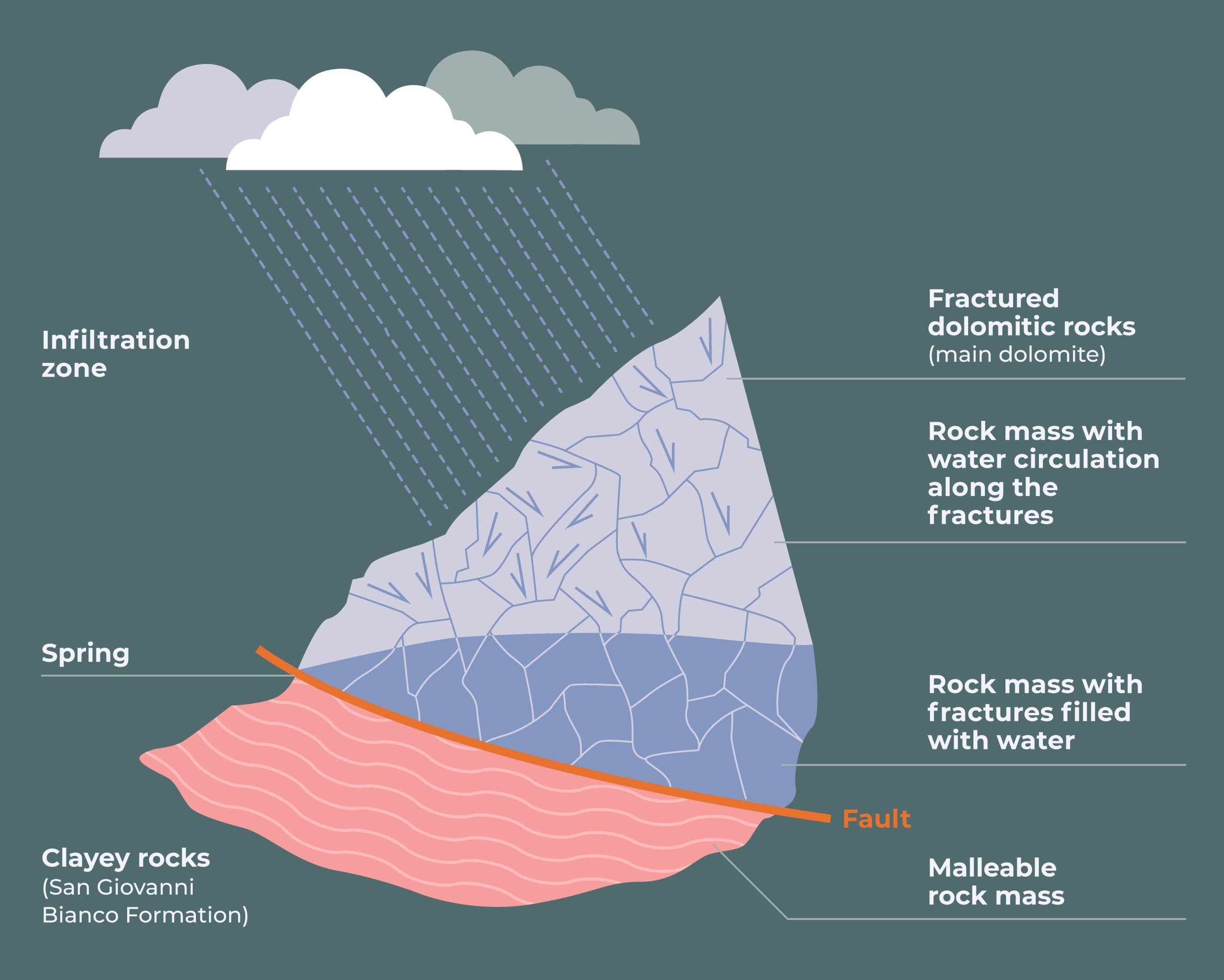 Diagram of springs origin – The presence of living beings (both animals and plants) in a given territory is closely linked to the availability of water. In the area of Piani d’Erna, the presence of water has allowed the development of dense vegetation and rich pastures. In addition to the Pesciola spring, other springs are widespread along the Nature hiking Trail.