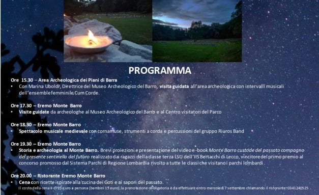 Durante l’evento saranno proposte storie e tradizioni delle popolazioni Gote che oltre 1500 anni fa abitavano sulle pendici del Monte Barro. Il programma comprende visiste guidate, spettacoli e la cena con ricette ispirate alla cucina dei Goti e ai sapori del passato.