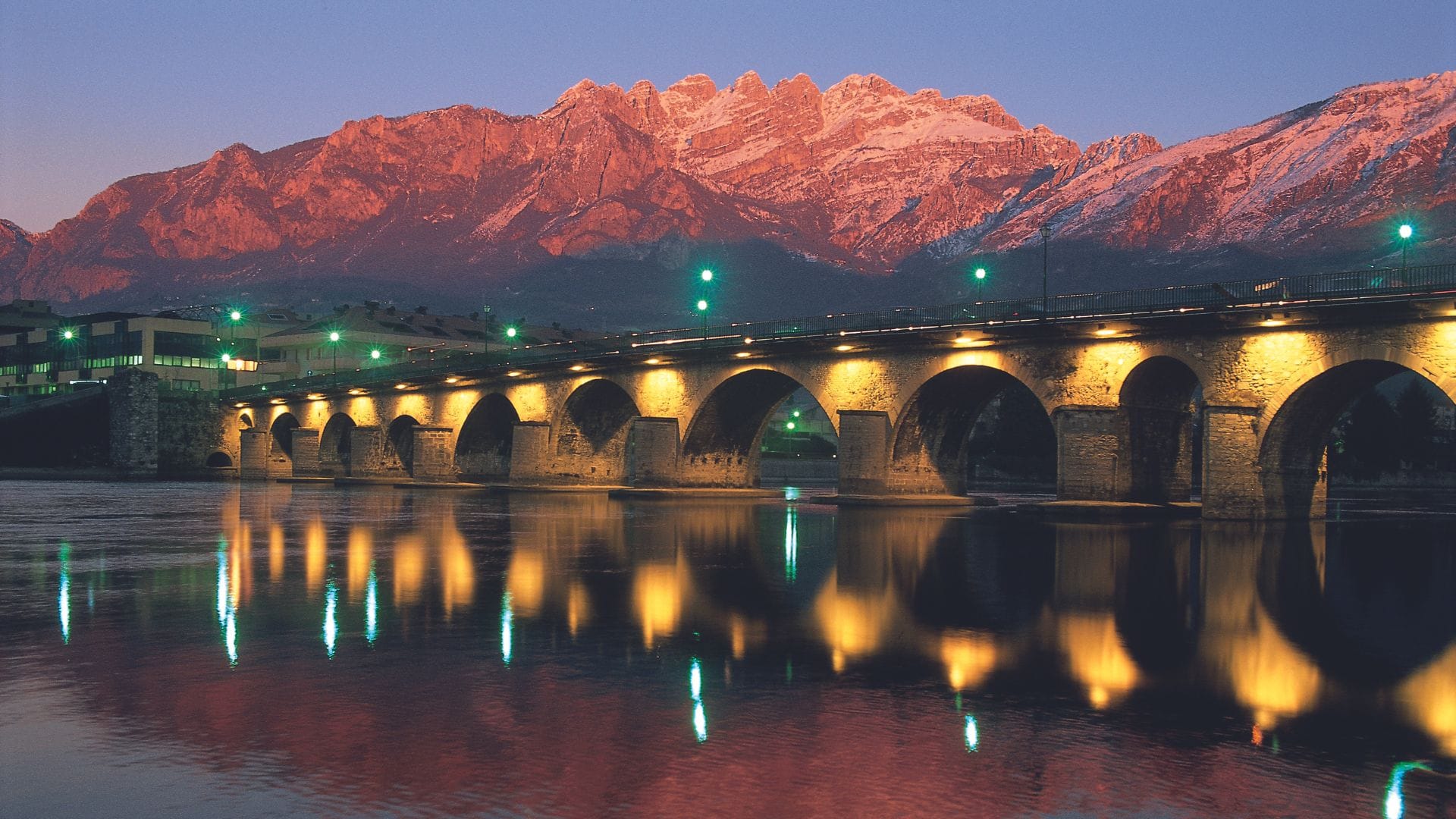 Costruito tra il 1336 e il 1338 per collegare Lecco a Milano, il Ponte Azzone Visconti, noto come “Ponte Vecchio” dai lecchesi, si è evoluto in una struttura più ampia costituita da undici arcate di diverse dimensioni, lungo 131 metri e largo 9,05 metri.